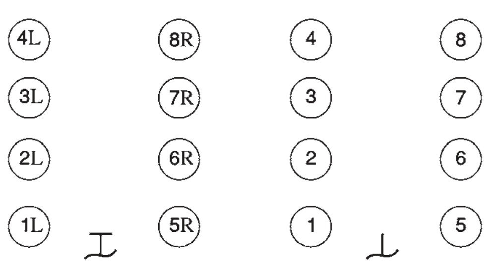 وقتی که سیلندر های طرف چپ 1 تا 4 و سیلندر های طرف راست 5 تا 8 می باشد. و یا به صورت زیر است: