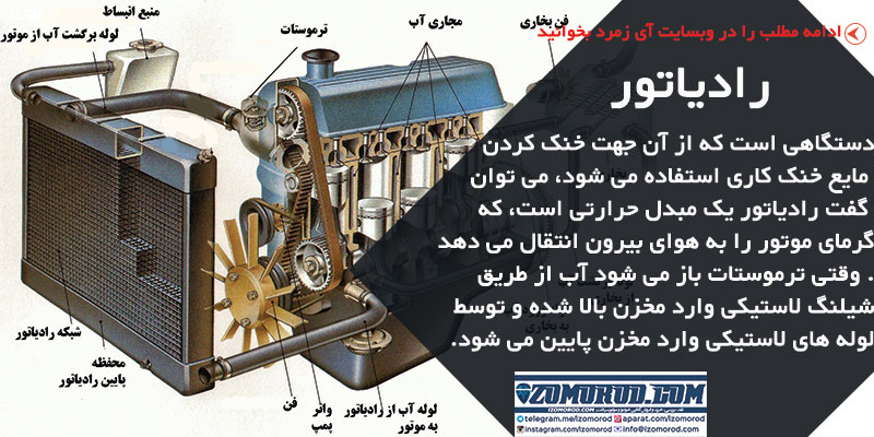 دستگاهی است که از آن جهت خنک کردن مایع خنک کاری استفاده می شود، می توان گفت رادیاتور یک مبدل حرارتی است، که گرمای موتور را به هوای بیرون انتقال می دهد. وقتی ترموستات باز می شود آب از طریق شیلنگ لاستیکی وارد مخزن بالا شده و توسط لوله های لاستیکی وارد مخزن پایین می شود.
